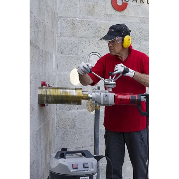 Met deze machine moet steeds droog geboord worden. Op deze machine moet je een stofzuiger aansluiten voor het afvoeren van bouwstof en het koelen van de diamanttanden door middel van lucht.