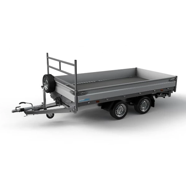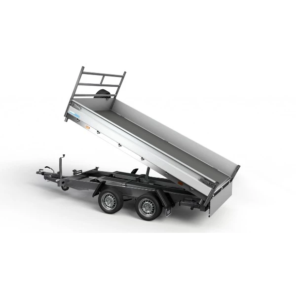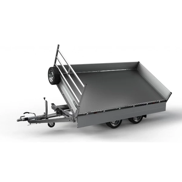 Deze plateau aanhangwagen is voorzien van een elektrische kipper fuctie voor het eevoudig lossen van uw lading. Door de pinnen onderaan te verplaatsten kan u de aanhangwagen over de linker, rechter of achterzijde laten kippen.