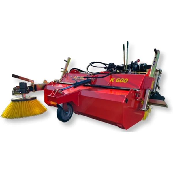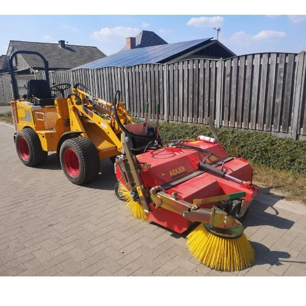 Hydraulisch aangedreven veegmachine die aan kniklader gemonteerd kan worden voor het reinigen van parking, Pleinen, ... . Deze borstelmachine is voorzien van een zijborstel waardoor je tot tegen de kanten van de bouw of in gooten kan borstelen.